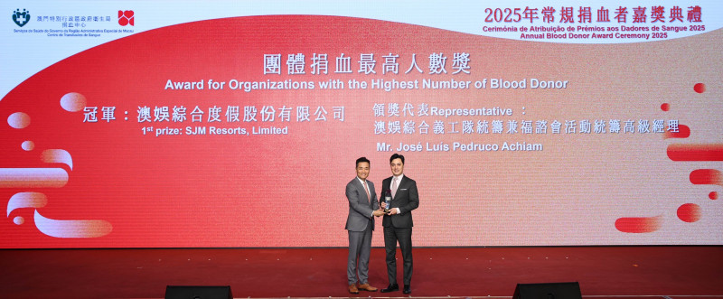 3 December 2025 – SJM Resorts, S.A. (“SJM”) was honoured with the “Highest Number of Donors – Group Award” and the “Outstanding Blood Donation Promotion Award” at the “Annual Blood Donation Award Ceremony 2025”. This award acknowledges SJM’s commitment to actively promoting and participating in blood donation activities.